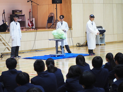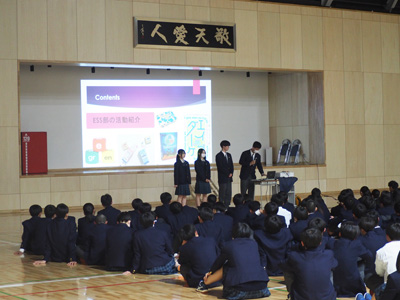 入学したばかりでまだ学校のことをよく知らない1年生に対して、2、3年生の先輩から生徒会と各委員会の活動についての説明や、各部活動・同好会の紹介およびパフォーマンスを行いました。